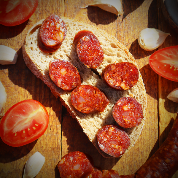 Składniki: Wieprzowina z mangalicy, boczek z mangalicy, wołowina, sól morska, czosnek 1,7%, przyprawy (słodka papryka, mielony kminek, czarny pieprz, pikantna papryka)