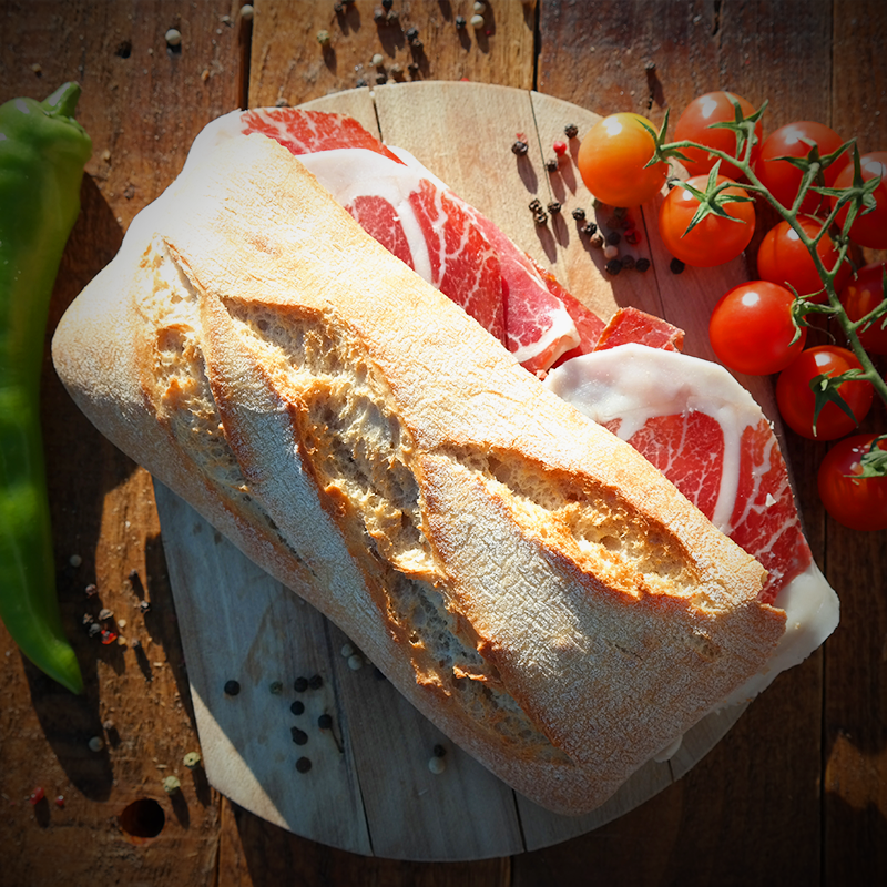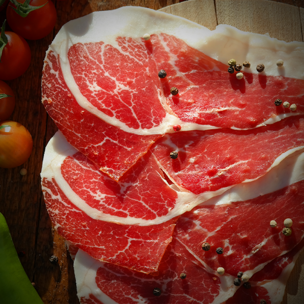 Surowiec pochodzi z całego uda naszej własnej mangalicy z wolnego wybiegu, wolnej od antybiotyków i GMO.