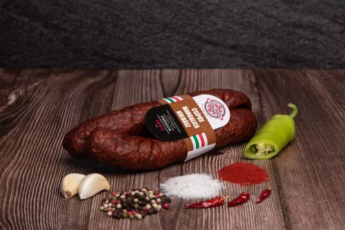 Tóalmási Csípős Mangalica Kolbász to pikantna, sucha, tradycyjnie dojrzewana, wędzona w kamiennych kominach kiełbasa, wytwarzana według tradycyjnej, rodzinnej receptury, która zawiera 100% kontrolowanego mięsa mangalicy, mieloną węgierską ostrą paprykę, czosnek, mielony kminek i mielony czarny pieprz.
