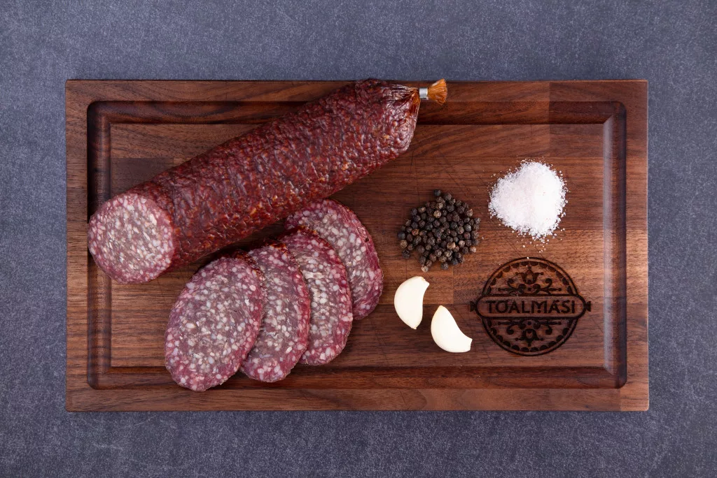 Salami z wołowiny szarej Tóalmási bez papryki to półsuche, tradycyjnie dojrzewające, wędzone w kamiennych wędzarniach salami bez papryki, wytwarzane według tradycyjnej, rodzinnej receptury, która zawiera wołowinę szarą, łój, mielone mięso, czosnek, sól kuchenną, kminek i mielony czarny pieprz. Konserwowane naturalnym dymem z drewna bukowego, wędzone na zimno.